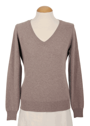 Women's V Neck Cashmere Sweater with Long Sleeve. Rib at Neck, Cuffs and Hem. 100% Pure Cashmere, 4 ply, Soft and Luxury, Thick and Warm, Beige Color.